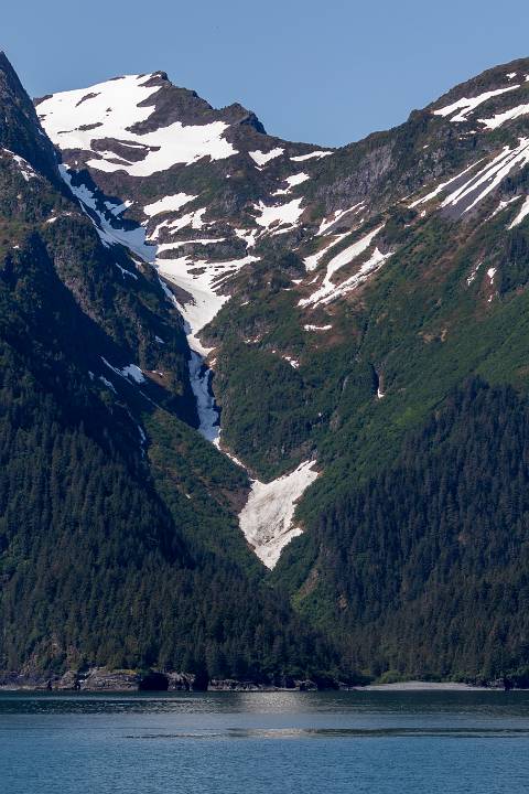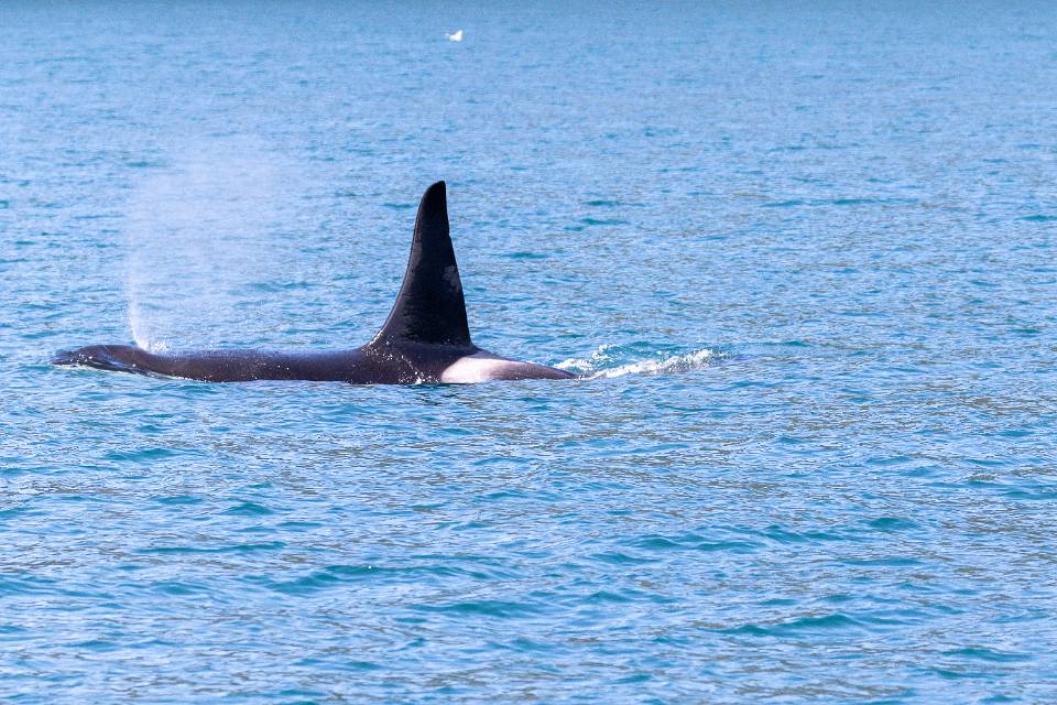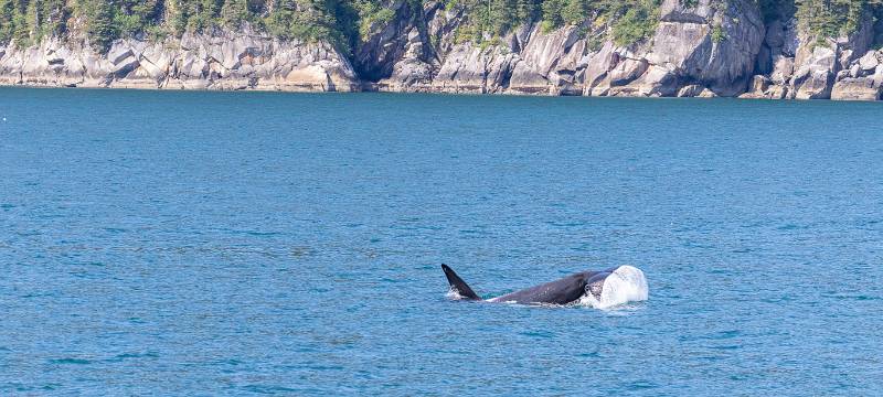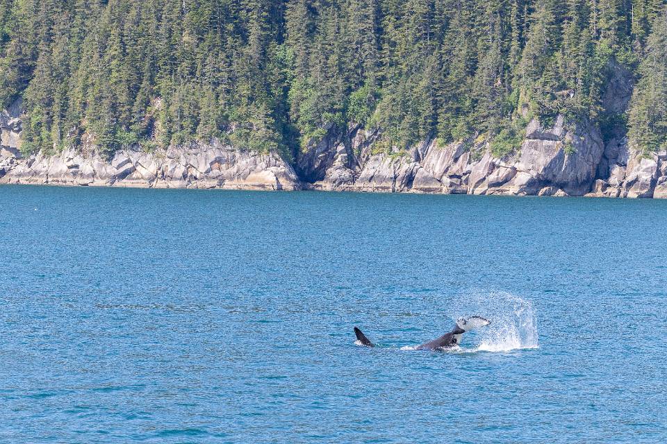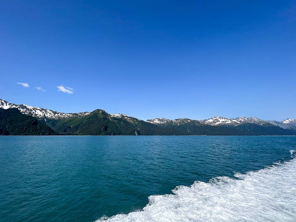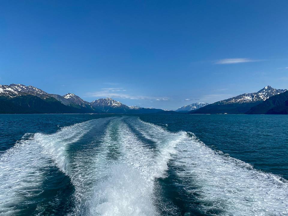 Resurrection Bay - er zijn berichten over orka's en de kapitein zet er vaart achter, Seward is maar een dunne streep langs het water.